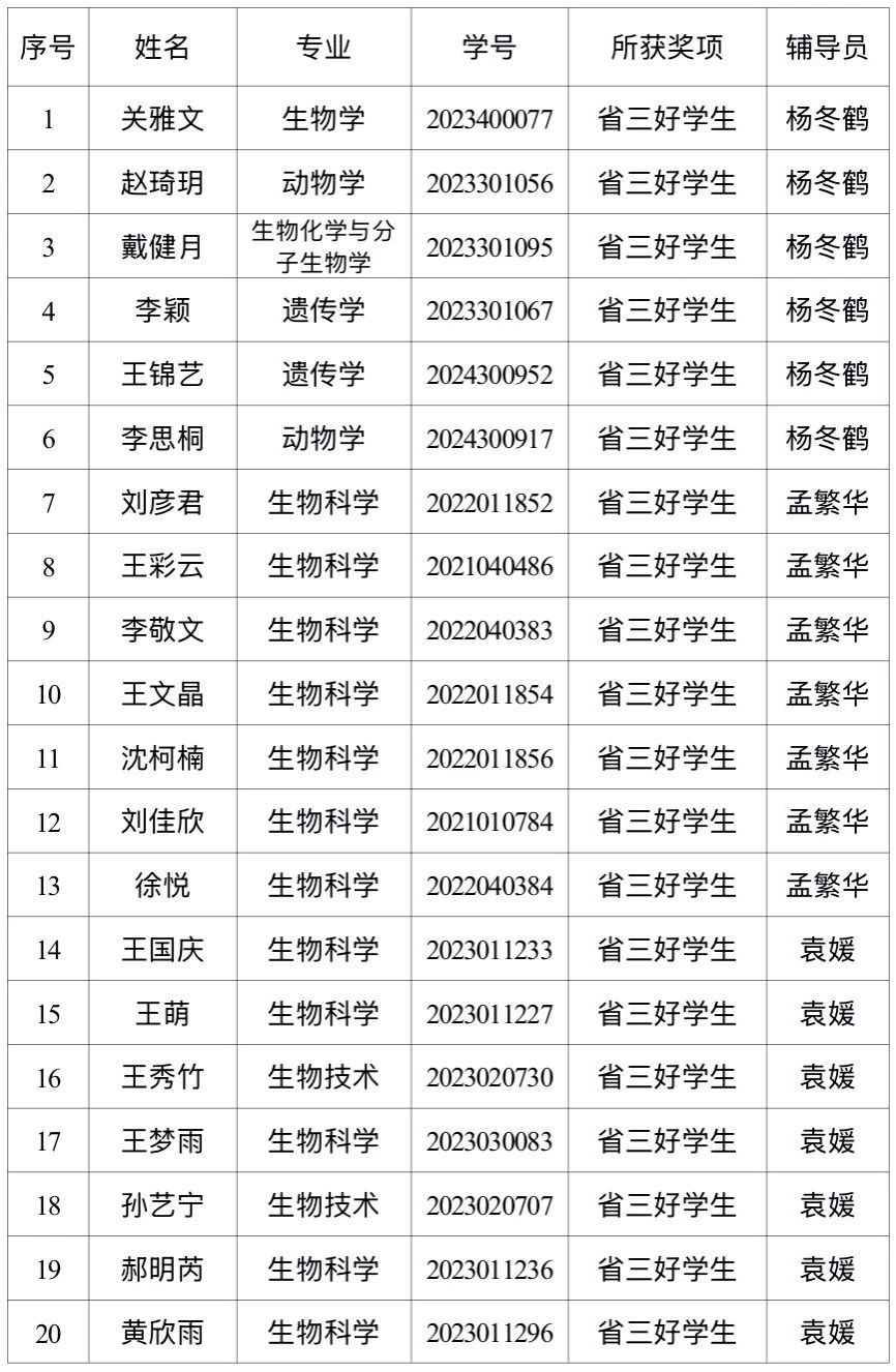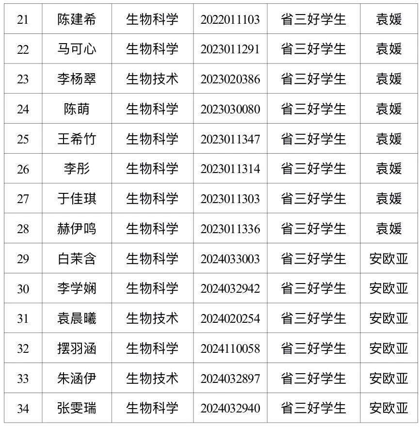 按照省教育厅《关于评选表彰2025年黑龙江省普通高等学校“三好学生”的通知》相关工作要求,生命科学与技术学院组成由党委副书记、各年级辅导员和各学科教师代表共计11人的联评工作小组,本着公平、公开、公正、择优的原则,严格按照文件要求开展评选工作。经学生本人申请、联评小组审核逐项打分、学院党政联席会审批,共评选出34名学生(其中:本科生28人、研究生6人)作为此次省三好学生推荐对象,现向全院师生予以公示。