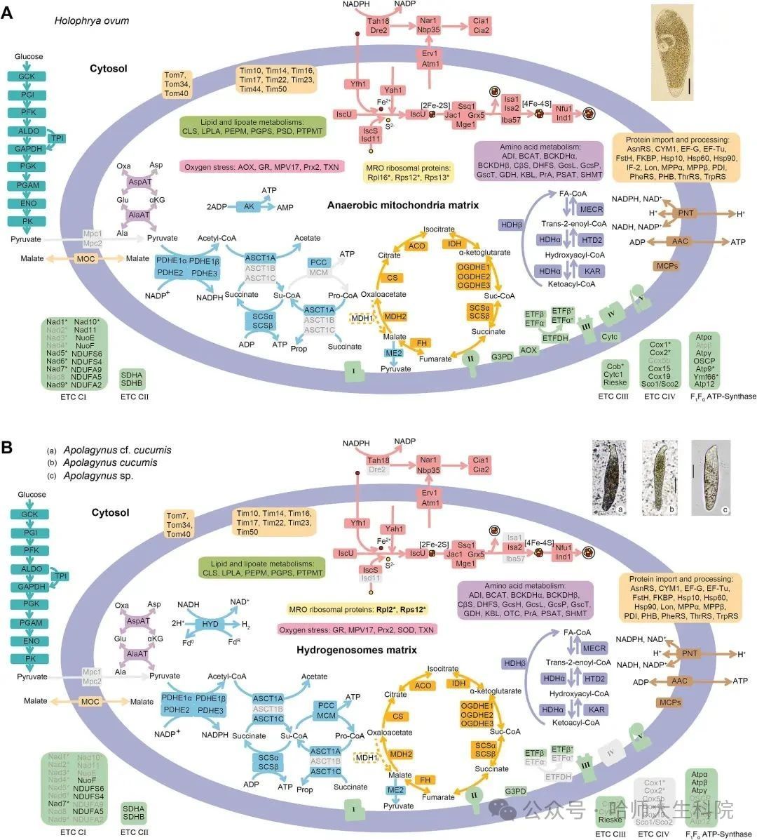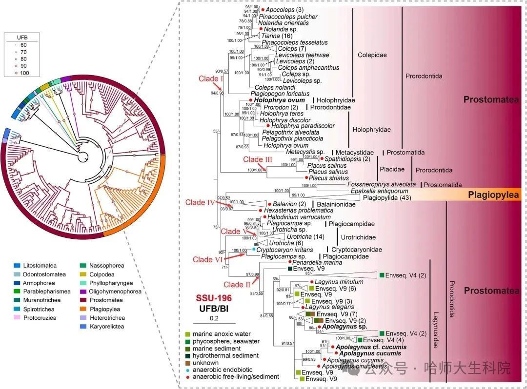 该研究通过比较不同纤毛虫类群的 MRO 代谢途径,旨在揭示线粒体向 MRO 多次独立演化的趋同进化模式;结合转录组与 SSU rDNA 数据,完善前口纲的并系性(paraphyly)及其与斜口纲(Plagiopylea)等近缘类群的系统发育框架;首次系统分析前口纲厌氧物种的 MRO 代谢表型差异,为阐明真核生物适应缺氧环境的分子机制提供新见解。