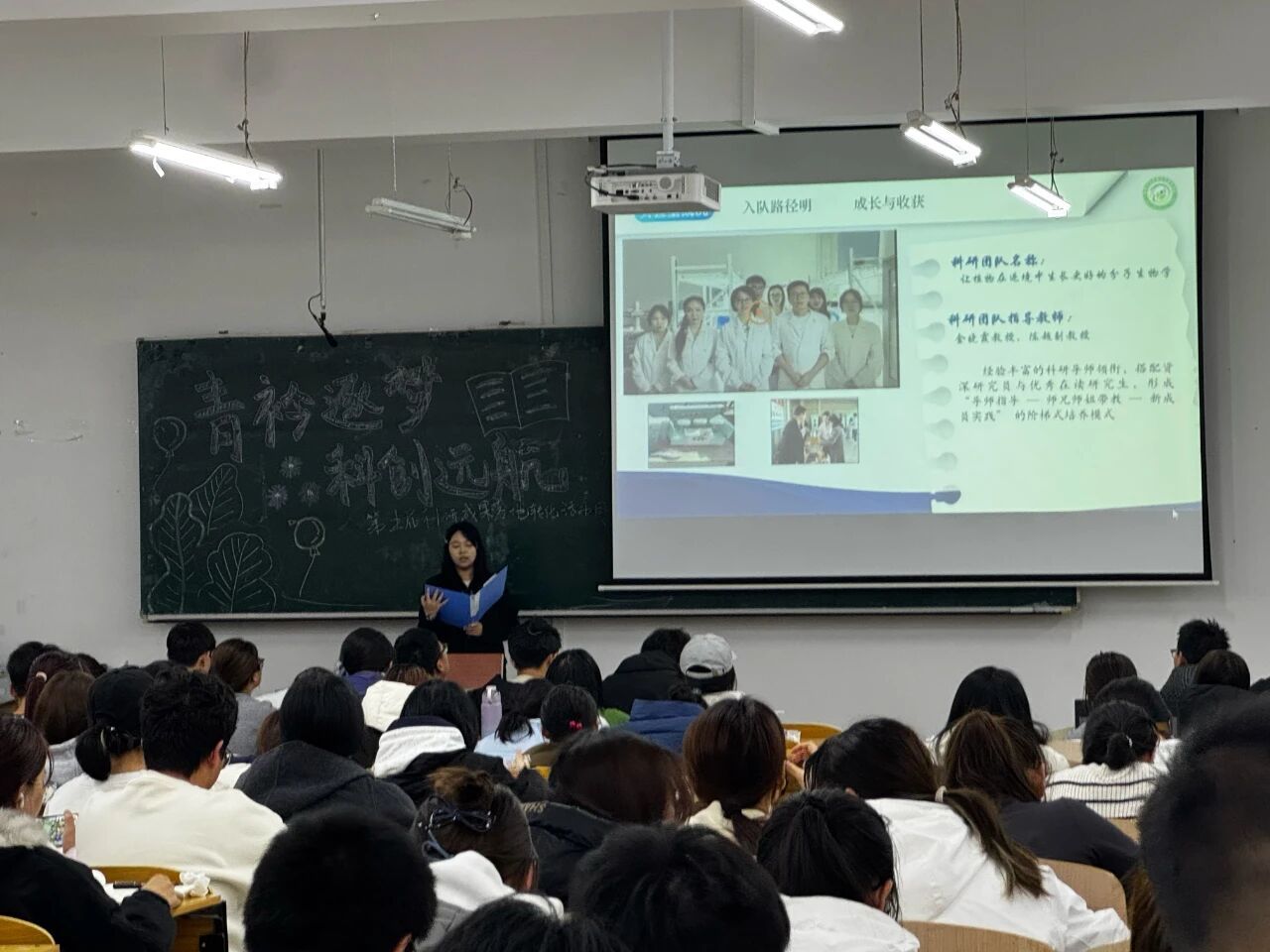 为深入贯彻学校《大学生思想政治教育“112349”工作模式实施方案》,推动落实《生命科学与技术学院本科生提质培养计划》,切实将思想政治教育与学生科创能力培养深度融合,进一步激发学生科技创新热情,提升学院创新创业教育水平,拓宽学生创新视野。2025年10月中旬,生命科学与技术学院举办第五届科创活动月,并于10月20日开展“青衿逐梦,科创远航”科研成果转化落地宣讲,本次宣讲由植物逆境分子生物学实验室成员徐烁担任主讲,2025级全体学生参加讲座。