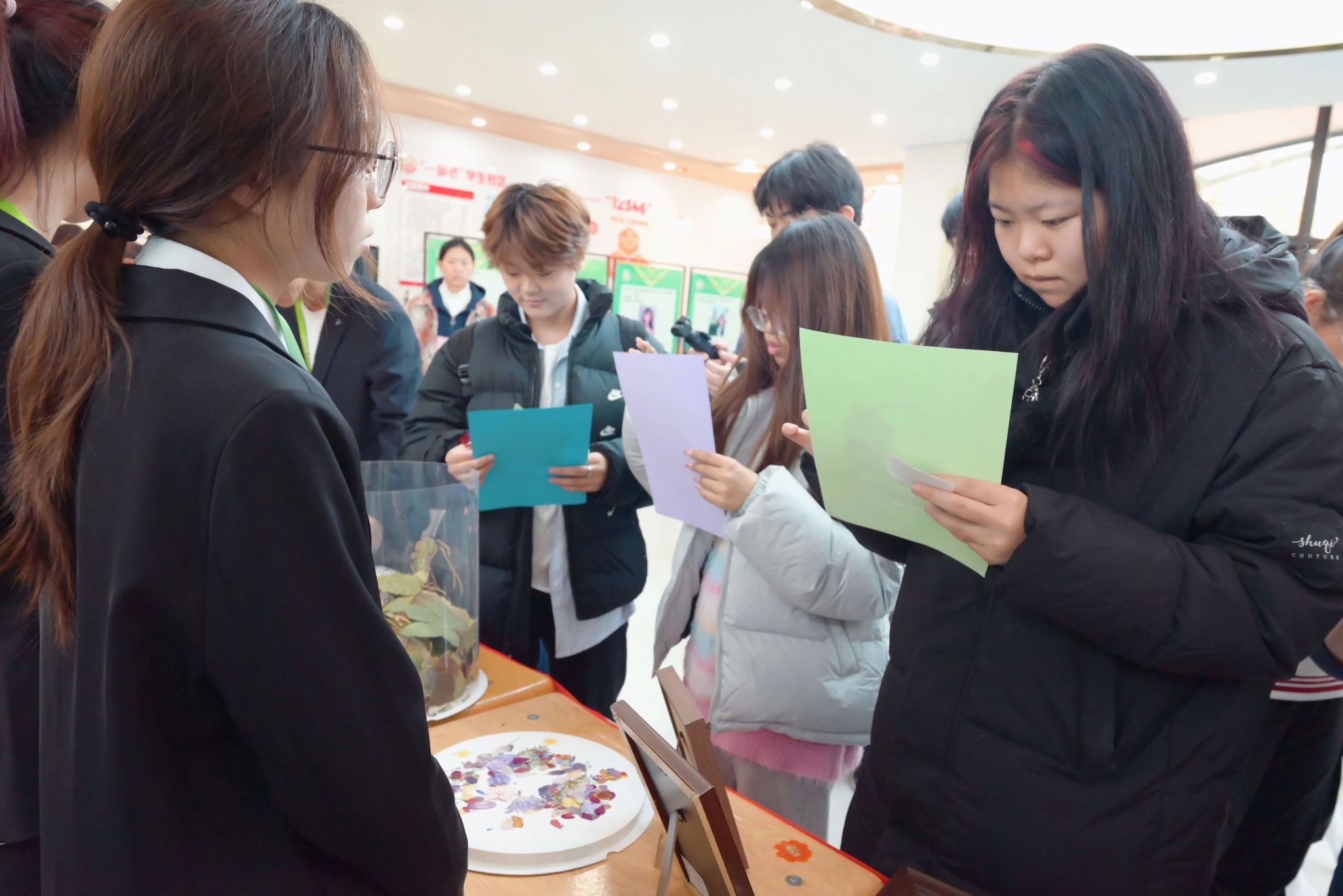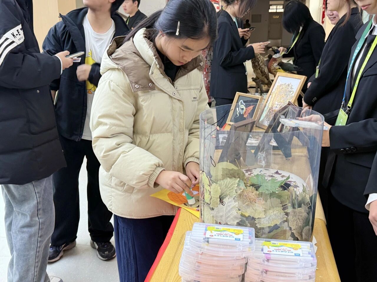 动手实践包括动手揭秘微观生命和拾叶留秋手作留痕两个部分,在“动手揭秘微观生命”体验中,师生亲手调试并操作显微镜,选取多种生物主题玻片进行观察,将抽象的细胞结构转化为直观的视觉认知,巩固生命科学基础知识点;“拾叶留秋手作留痕”环节依托生科特色教学课程,实现科学与美学的巧妙结合师生用树叶、花瓣自由拼贴植物粘贴画作品,彰显学院在生物课程中融合艺术与技术的特色,实现了科学知识与手工创意的深度结合,让师生在实践中尽享自然之美与创作之乐。