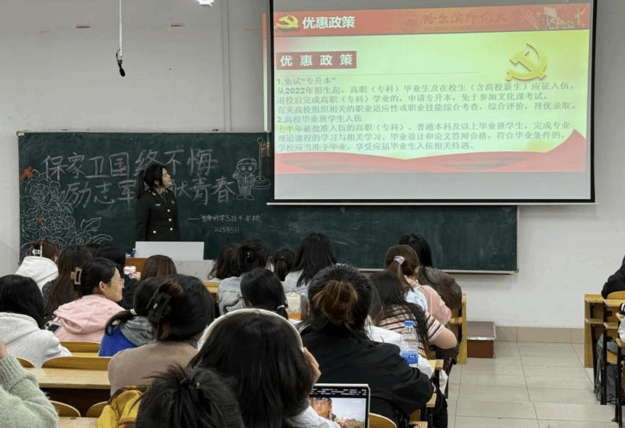 5月19日,学院举办“保家卫国终不悔,励志军营献青春”主题宣讲会,由23级优秀退伍学生姜敏作为主讲人。姜敏以真挚动人的语言讲述了自己的军旅生涯,从艰苦的军事训练到难忘的军营生活,从磨砺成长的心路历程到对责任担当的深刻感悟,她的分享生动展现了新时代青年军人的风采。现场气氛热烈,姜敏的讲述深深触动了每一位听众,不仅激发了同学们携笔从戎、报效祖国的壮志豪情,更让家国情怀与社会责任感在青年学子心中扎根生长,激励着大家以实际行动为国防事业贡献青春力量。