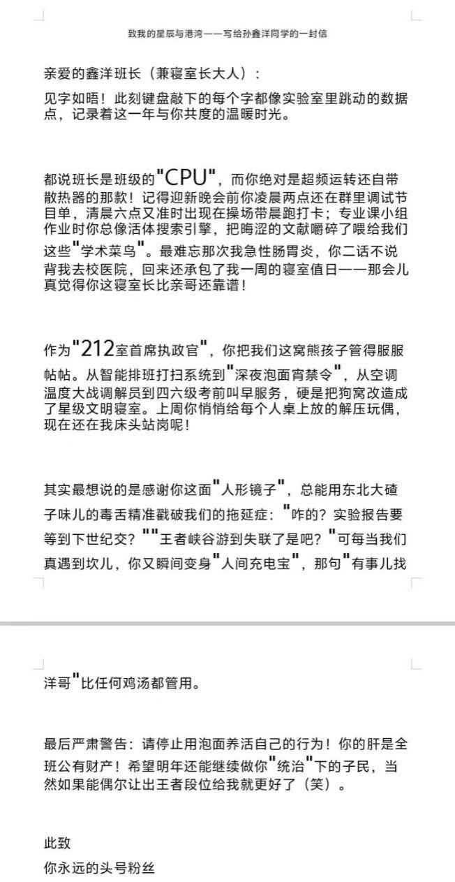 5月19日至20日,学院开展“不忘恩情,感谢有你”主题感恩书信活动。活动中,同学们以文字为媒、以电子信件为介,将心底的感激之情化作温暖笔触。或向慷慨相助的校资助中心感谢求学路上的珍贵支持、或向辛勤耕耘的师长表达传道授业的深切敬意、或向至亲挚友倾诉陪伴成长的点滴感动......一封封饱含深情的信件,承载着真挚的爱与感恩,在校园中传递温暖、播撒善意,让感恩之风浸润校园每个角落,推动感恩文化在青年学子心中落地生根、开花结果。