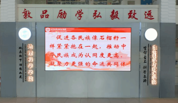 9月22日至9月30日,为丰富校园文化、构筑中华民族共有精神家园,我院以理工三一楼大厅屏幕为载体,开展“云端传扬民族韵,线下深耕团结根”民族团结文化浸润活动,通过展示“中华民族一家亲,同心共筑中国梦”等民族团结相关标语,以潜移默化的文化浸润方式,为丰富校园文化、构筑中华民族共有精神家园注入力量,让每一位学生深刻认识民族团结的重要意义,有效推动了民族团结理念在校园的传播与深化。