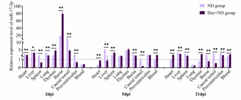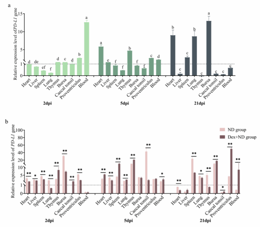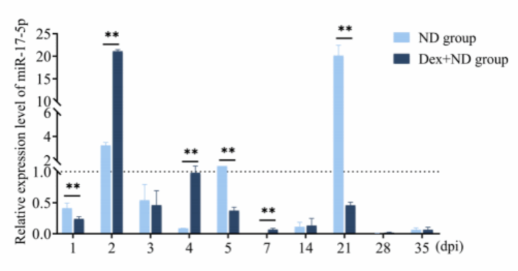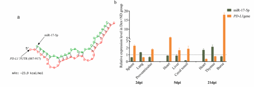 程序性死亡配体-1(PD-L1)作为一种关键免疫检查点,广泛表达于免疫细胞、内皮细胞及肿瘤细胞等多种类型细胞。PD-L1可通过与程序性细胞死亡蛋白1(PD-1)受体结合,抑制T细胞增殖、活化及多种细胞因子分泌,进而介导免疫抑制反应。本研究揭示PD-L1在不同组织中均对NDV免疫应答发挥积极的正向调控作用。进一步研究表明,PD-L1通过调控中枢免疫器官、外周免疫器官及黏膜免疫系统的免疫活性在SIIS影响NDV疫苗免疫应答过程中起重要作用,PD-L1是参与SIIS影响免疫应答过程的关键因子。此外,该研究还发现miR-17-5p/PD-L1通路是多个组织(主要包括循环、消化和免疫系统)参与SIIS影响NDV疫苗不同免疫阶段的关键分子调控机制。血清中循环miR-17-5p表达水平具有作为早期诊断SIIS影响NDV免疫应答分子标志物的潜在应用前景。本研究不仅深化了经典免疫检查点功能调控的理论基础,也为早期诊断和靶向干预以减弱SIIS影响进而改善疫苗免疫效果提供了重要的分子标志物与靶点参考,同时为优化NDV疫病防控、保障家禽健康养殖提供策略方向。