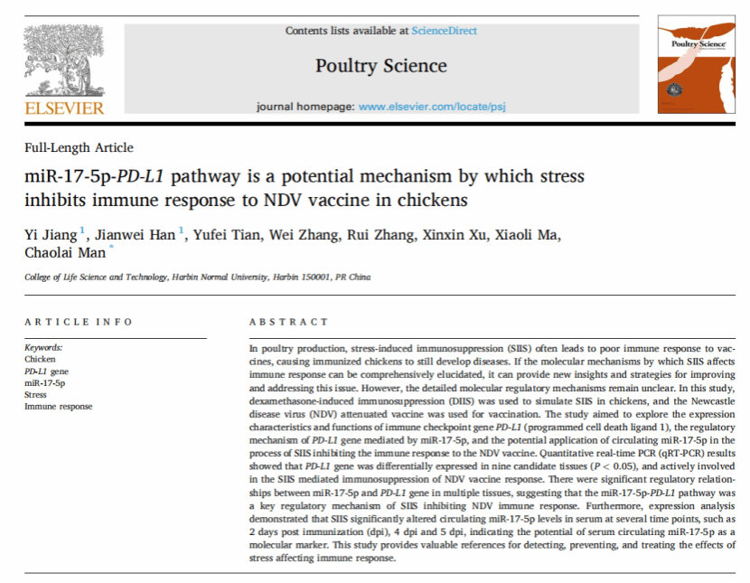 2025年6月,国际知名学术杂志Poultry Science(中科院农林科学2023一区Top和2025二区Top期刊)发表生命科学与技术学院满朝来教授团队研究论文“miR-17-5p-PD-L1 pathway is a potential mechanism by which stress inhibits immune response to NDV vaccine in chickens”。《Poultry Science》创刊于1921年,作为百年期刊是研究家禽领域高质量研究论文的权威来源。该论文主要研究应激影响雏鸡新城疫疫苗免疫反应的功能与机制,重点揭示miR-17-5p/PD-L1通路在这一过程中的调控作用。哈尔滨师范大学为该论文的独立完成和唯一署名单位,满朝来教授为论文通讯作者,博士研究生姜懿和硕士研究生韩建伟共为第一作者。该研究得到黑龙江省自然科学基金(PL2024C021)资助。