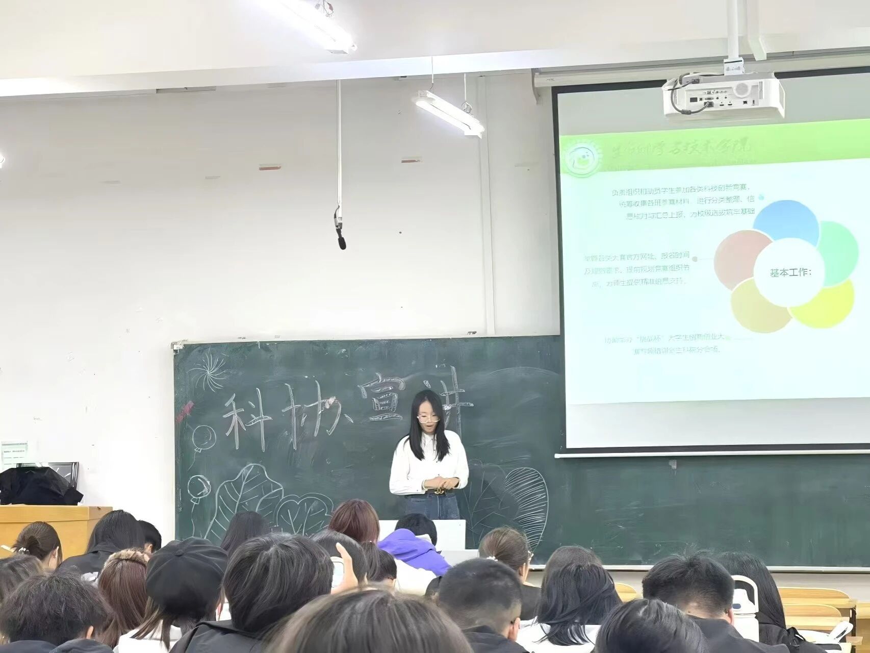 为全面落实立德树人根本任务,深入推进“三全育人”综合改革试点工作,结合学校《大学生思想政治教育“112349”工作模式实施方案》和《2025级新生入学教育方案》,进一步激发学生科技创新热情,提升学院创新创业教育水平,营造浓厚的创新创业氛围,形成良好的创新文化和风气。10月9日,生命科学与技术学院于理工三号楼320室和422室举办科创竞赛宣讲会。本次宣讲由学生团委科技创新协会主席付宇彤、活动策划部部长徐蕾、指导培训部部长谢可欣担任主讲,2025级全体学生参加讲座。