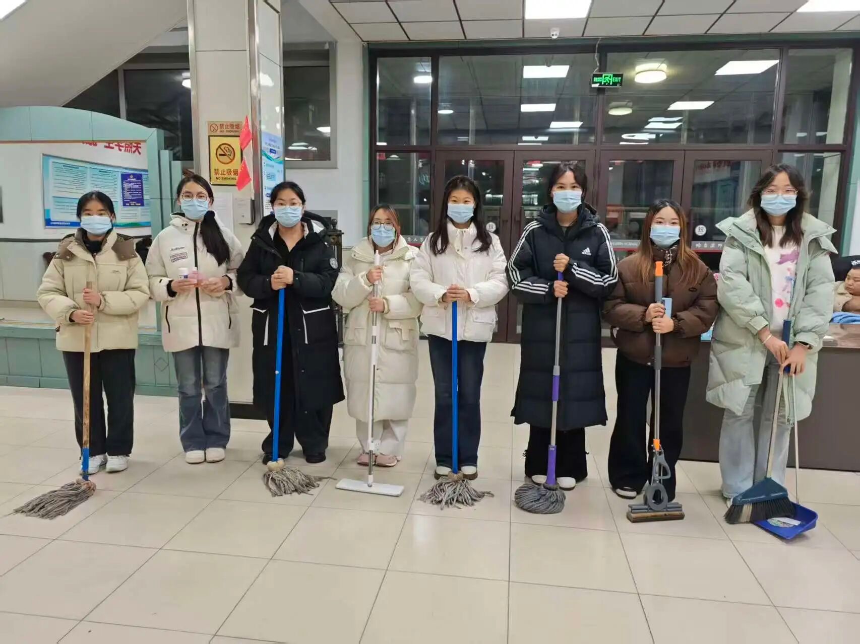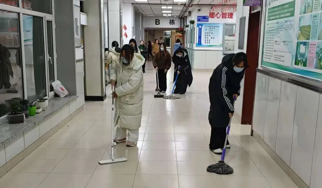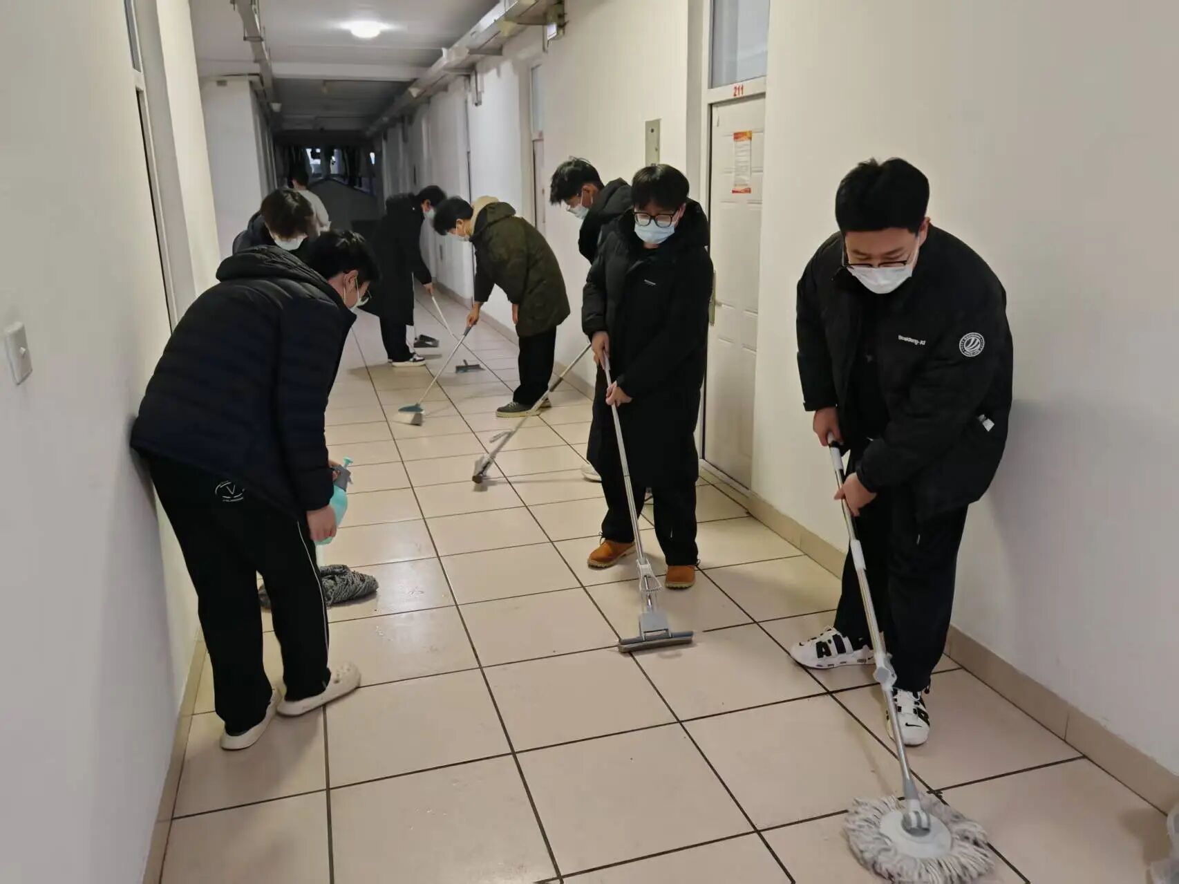 活动开始,同学们手持拖把、扫帚、消毒喷壶等工具,对寝室楼道的瓷砖地面进行拖洗作业,从楼道近端到远端逐步推进清洁,然后对公共区域地面进行清扫,再用喷壶对接触频繁的区域进行消杀处理。参与学生均佩戴口罩,按分工完成各自负责区域的清洁、拖洗与消杀流程,有序推进寝室公共区域的消杀工作。随着消杀工作顺利完成,各寝室及走廊均保持开窗通风,空气流通,环境整洁度显著提升。