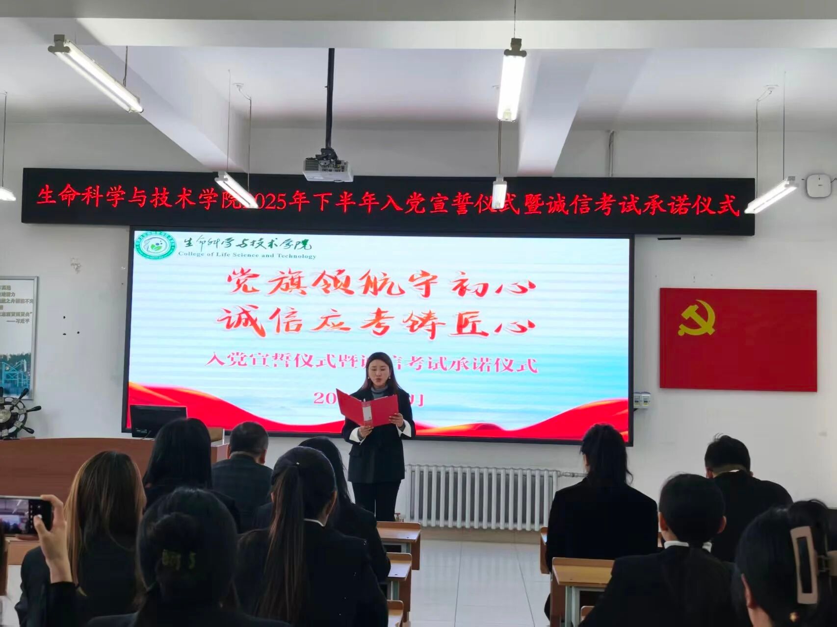 为强化新发展党员教育引导,筑牢信仰之基、切实增强党员责任感与使命感,12月17日,生命科学与技术学院于理工三号楼323室召开“党旗领航守初心,诚信应考铸匠心”2025年下半年入党宣誓仪式暨诚信考试承诺仪式。学院党委副书记高阳,团委书记安欧亚,全体辅导员参加会议。会议由本科生第三党支部书记李婧雯主持。